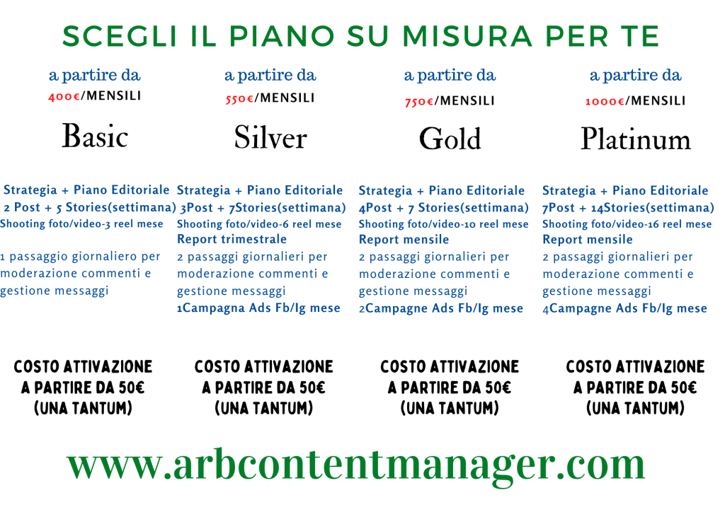 Con i piani Basic, Gold e Platinum si possono avere pacchetti gia’ definiti per soddisfare pienamente molteplici esigenze e linee guida, restando aperta la possibilita’ di adattarsi e implementare l’offerta.
